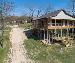 The home sits proudly atop piers with outdoor staircase leading to the porch overlooking the water.