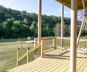 The upstairs porch boasts 180 degree view of the river, and full length sliding glass doors open up into the grand room of the house.
