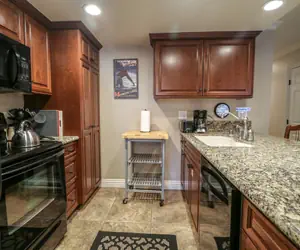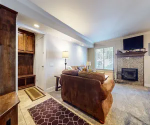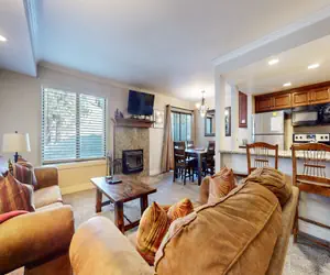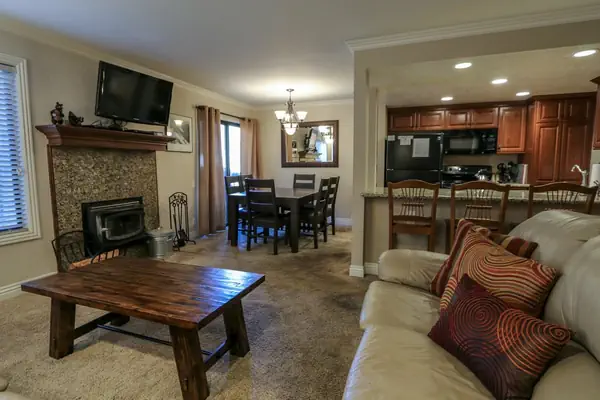 This two bedroom, two bathroom condo located in Mammoth Lakes is a quiet, simple and clean retreat for your Winter or Summer vacation. The living room has a large sectional sofa that will fit the entire family, the kitchen and bathrooms are outfitted with granite countertops, the bedrooms have custom ceiling fans to keep you cool in the Summer, and the living room has a cozy wood-burning fireplace to keep you warm in the Winter.