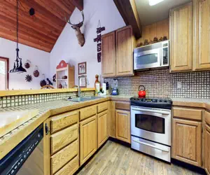 Uniquely decorated in traditional mountain style this 3 bedroom/loft, 3 bathroom condominium sleeps up to 11 and is walking distance to Eagle Lodge. This spacious townhome is located in a quiet residential location, across from multi-use bike path and Sierra Star Golf Course. Enjoy a full kitchen with bar seating for 4 and dining area that seats 6. Cozy up around the wood burning stove on the large sectional, and enjoy the flat screen TV. On the lower lever there is a spacious mud room entry from the 2-car garage, and features two bedrooms and a bathroom. The first bedroom has a queen bed with flatscreen TV, the second bedroom also has a queen bedroom with flatscreen TV and adjacent jack and jill style full bathroom. The master bedroom on the middle level has a King bed with a flat screen TV and desk so you can work/school remotely, and a private en-suite full bath. There is an additional full bathroom on the third level along with the loft featuring a bunk bed with Twin over Twin and 2 additional Twin beds. This unit offers WiFi internet access. There is a washer and dryer available so you can have all the conveniences of home. With a large south facing deck on the middle living room level featuring a BBQ grill, this makes this the perfect home to entertain and grill with all of the family. The complex offers 2 car garage parking (garage clearance 6' 6"), Jacuzzi, and tennis and pickleball courts. This unit is pet friendly so you can even bring Fido! Please Note: This property makes use of surveillance equipment outside the home. A camera is located at the front of the home monitoring the front door and a camera monitoring the garage door. The townhouse is within walking distance to Eagle Lodge, or cross the street and you can jump on a free shuttle for a quick ride to the mountain. You are also a short ride to the Old Mammoth downtown part of Mammoth. All guests receive complimentary full access to Snowcreek Athletic Club to enjoy facilities including indoor and outdoor heated pool, steam/sauna, full fitness facility, yoga, pilates and cycle studio and more. Guests will be provided two parking passes. If more parking is required than what is allotted, feel free to call our office for alternative options. Our calendar is updated in real time. (Property Certification #: TOML-CPAN-14016) Unit Code = TNV14