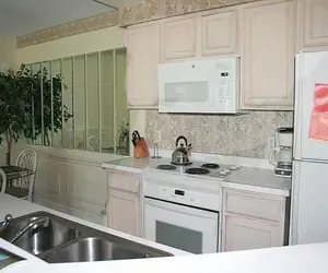 Our One bedrooms adjoining a large, open great room that encompasses the kitchen, dining, and living areas including a full-length balcony. In these Villas, the full capacity kitchen is fully equipped with all major and small appliances including a dishwasher for easy clean-up. A full-size washer and dryer are available in all One and Two Bedroom Villas. In some instances, the sofa will convert to a full-size sleeper.