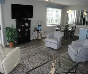 • Two bedrooms adjoining a large, open great room that encompasses the kitchen, dining, and living areas including a full-length balcony.