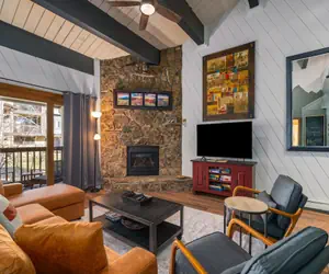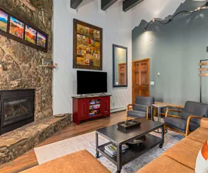 -- Living Room: Flat screen TV, gas fireplace, queen sleeper sofa