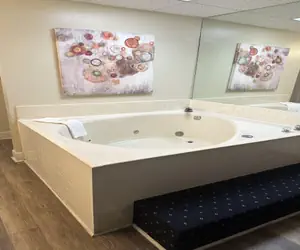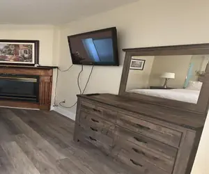 The bedroom is accommodated with a king size bed, in-room 2 person Jacuzzi, and gas fireplace for your enjoyment.
