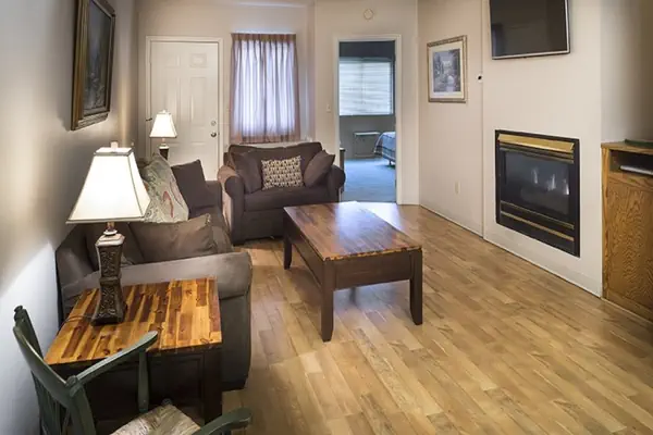 The living room has a gas fireplace and sleeper sofa for extra guests.