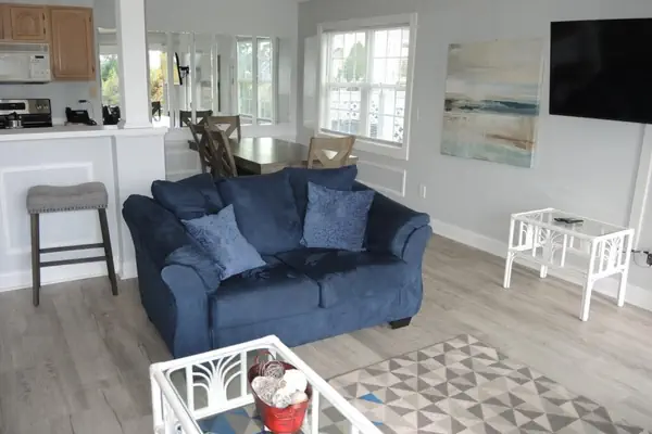 Two bedroom adjoining a large, open great room that encompasses the full kitchen, dining and living area and includes the full length balcony. The kitchen is equipped with microwave, dishwasher, stove/oven, refrigerator, coffee maker, and toaster. Each unit is furnished with a basic set of pots and pans, utensils and dishes, cups and glasses. You also have a full size, stackable washer and dryer in your unit.