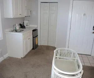 The studio unit has a small kitchenette with coffee maker, sink, dorm size microwave and refrigerator. Each studio unit is furnished with basic utensils, dishes, cups and glasses.