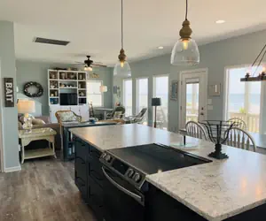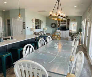 A sundeck along the private boardwalk to the beach allows you to soak up the sun without the sand, making it easy to enjoy the outdoors at your own pace. Inside, the home features 5 bedrooms and 4.5 bathrooms, along with an open-concept living, dining, and kitchen area designed for gathering. The dining area comfortably seats 14 guests, making shared meals a breeze.
