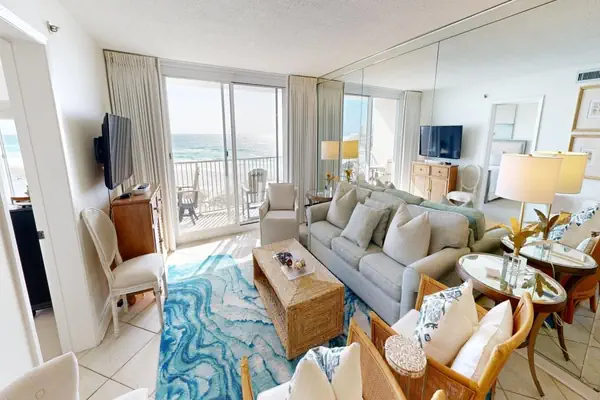 The living room has a large smart flat screen HDTV and offers an unparalleled view of the Gulf of Mexico through the sliding glass doors leading to the balcony.