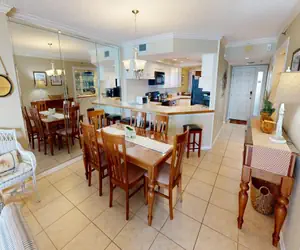 The large, open kitchen has a plethora of counter space, and all the full size appliances, pots, pans, dishware, and silverware needed to prepare your favorite meal. When the meal is prepared, you will find no issues in seating arrangements, as this condo seats 6 in the dining room and 4 at the bar.