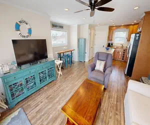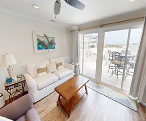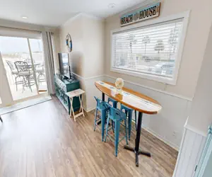 The living room has plenty of comfortable seating to watch a movie after spending all day at the beach. The adjacent dining area features a table with seating for four. The couch folds out to a Queen Sofa Sleeper.