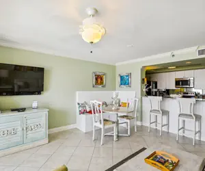 Once inside the condo, the welcoming view granted by the floor to ceiling glass wall of the condo will sweep you off your feet. The Living Room is floored in authentic tile and offers a couch that doubles as a Queen Sofa Sleeper, a chair, a flat screen wall mounted HDTV with Sound Bar, a DVD Player, and balcony access.