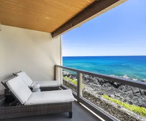 It's located on the highly desirable 2nd floor in the most sought after building 5. This is the only building that has ocean in the front and golf course in the rear. Ocean & coastline views all the way to Kailua Town where you can see the cruise ships in the Bay. Sunsets year round, whale watching in season & dolphin watching, cool ocean & mountain breezes & a golf course views from the guest bedroom with 2 twin beds. The Master bedroom has a King sized bed that has direct oceanfront views. Spacious 1,170 sq. ft. & a kitchen that opens to a great room with ample room for dining and living space. There is a 245 sq. ft. covered oceanfront lanai that provides room for a table & chairs for oceanfront dining if you wanted! 2 chaise lounges included!