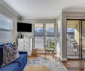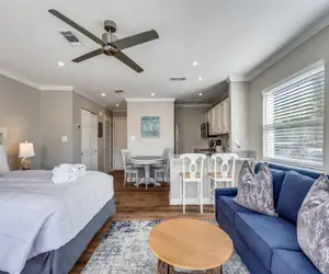The living room functions as the bedroom as well. You won't have to worry about sleeping on a thin Murphy bed mattress, since these owners have set up an actual Queen sized bed. A large flat screen TV is located on the wall allowing you to enjoy the TV from bed or the new plush sofa sleeper.