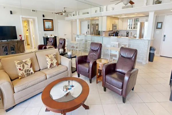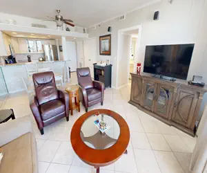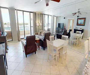 The Guest bedroom has a Queen-size bed, a flat screen HDTV, and balcony access. The Master bedroom has King-size bed, a flat screen HDTV, and balcony access. The spacious balcony is accessible from the living room and both bedrooms and offers stellar views of the Destin Harbor, Norriego Point, the Destin Bridge, and the East Pass.