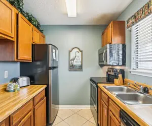 The kitchen comes completely equipped with all the full size appliances, pots, pans, plates, dishes, and silverware you would need to prepare your favorite dish.