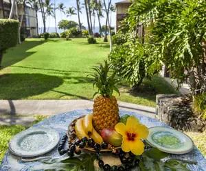 Kona Isle is known for its iconic oceanfront lawn, lined with lounge chairs for sunset viewing, whale watching (in season), and listening to waves right at the shoreline. Guests enjoy access to a heated oceanfront pool, a BBQ pavilion with gas grills, well-kept tropical landscaping, on-site laundry facilities, and assigned parking.