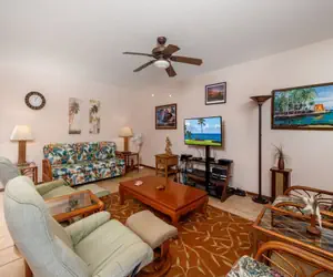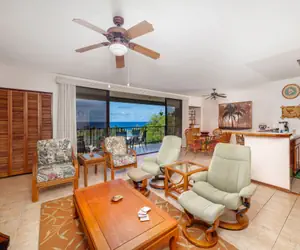 This beautiful, private top floor condo at Kahaluu Bay Villas is quite the gem. The unit has a well-equipped kitchen and all the rooms are spacious with a balcony overlooking the pool and the ocean. The bedrooms and baths are wonderfully appointed. The living area is open and airy. Everything that is needed for staying in a condo is provided, even the snorkeling gear. The views of Kahaluu Bay and the condo pool from the balcony are unobstructed and beautiful. Watching the sunset or the boats in the bay from the balcony is so relaxing. The woven drapery shutters in the living room are a fantastic feature that not only helps with blocking out the sun but is excellent for keeping the unit at a much cooler temperature than blinds!