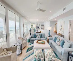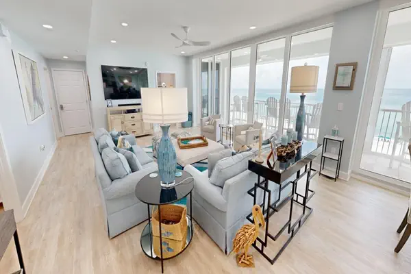 Step into the calming oasis of Oceania 506. This beautiful beachfront 3 bedroom/3 bath condo greats you with ocean views as soon as you walk through the front door. The kitchen is located on the right when you walk into the unit. The kitchen is decked out with stainless steel appliances and granite countertops. You can cook breakfast, lunch or dinner in this fully equipped kitchen and still enjoy the Gulf of Mexico from the dining area that seats 8.