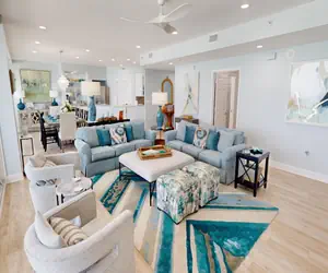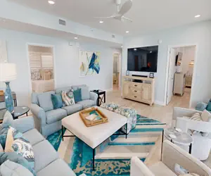 Two guest bedrooms are located to the left of the living room. One guest bedroom offers a King size bed. The second guest room offers a King size bed and a Full set of bunkbeds. The spacious Master bedroom offers a King size bed and Gulfside views from the bed. You can also access the large 5th floor balcony from the Master Bedroom.