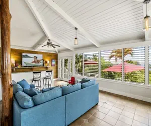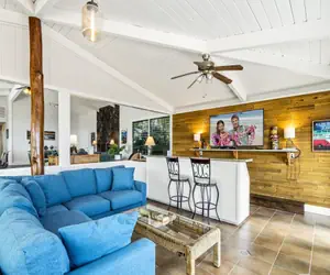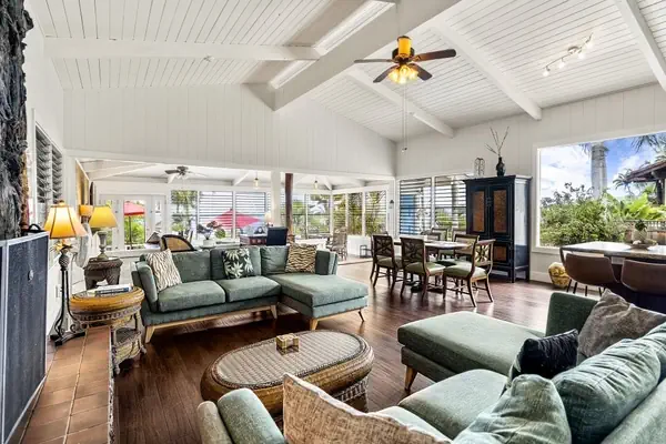 The home features a large, open-concept living, kitchen and dining area. It is also just two steps down to the family room and bar, which opens onto the lanai. In the family room, there is a 65” 4K TV equipped with cable and Chromecast, so you can watch Netflix, Hulu, and more streamed directly from your devices. High speed WiFi is available throughout the home. For dining, there are two tables that seat four each, plus the lanai has an outdoor table for four or more. The living room has high ceilings and two large couches, as well as a lava-clad fireplace.