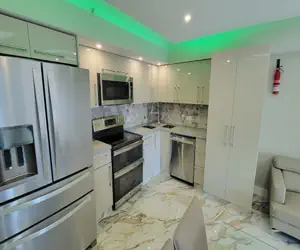 Apartment 521 renovated January 2024, is a larger 1200 square ft with 3 bedrooms (convertible 4th bedroom) a bonus room in primary bedroom that can be used as a nursery or for additional sleeping for one with 2 full bathrooms. One bathroom has a tub and shower comb and the guest bathroom has a walk in shower. Primary bedroom with its own bathroom has 2 Queen size double beds and bonus room as described above. Amazing sunsets with views of the Intracoastal waterways, marina, canal and Miami City skyline views. Guest bedroom has 3 adult size twin beds. We can, upon request, assemble 2 twins to a king double. 2 twin beds in 3rd bedroom (no windows) and converted den is final bedroom with 1 twin. Great room includes living room, dining area, washer dryer and full kitchen with all cooking utensils, dishes and glasses.