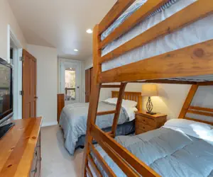 Downstairs are where the 2 bedrooms are situated. The primary bedroom features a queen sized bed, flat screen TV, walk in closet, and private balcony entrance. The en suite primary bathroom features a dual sink vanity and a tub/shower combination. The guest bedroom features one double bed, a twin over double bunk, a flat screen TV, and a private balcony entrance. The private stacked washer and dryer are also situated downstairs for your convenience. There is also a queen sleeper sofa in the living room to accommodate additional guests.