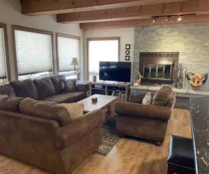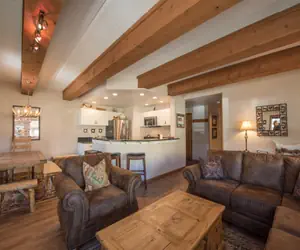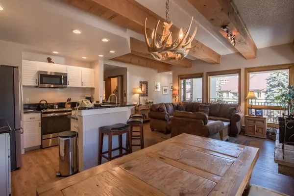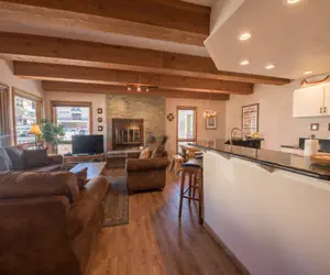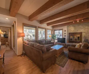 • This cozy 3BR/3BA 3rd floor residence has a stone tile entry that leads to a spacious open floor plan complete with a comfy sectional sofa, wood burning fireplace, and large flat screen TV. Rustic log furniture in the bedrooms lend a ski lodge feel and the master bathroom is graced with a beautifully tiled walk-in shower. From your private balcony, you will catch a glimpse of the lifts and base area across the street. Not far from your front door is the outdoor hot tub and common grill with a dining table overlooking Mt Crested Butte. Full laundry facilities in unit. Sleeps 8 comfortably with a King in the master bedroom, a king in the master guest room, and 2 sets of bunk beds in the guest room. Outdoor entry access.