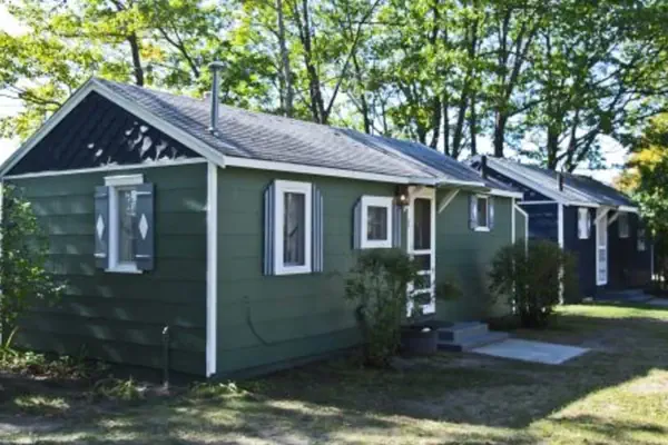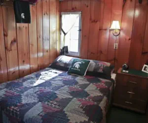 Cabin 1 - "Cedar Village" is a lakefront unit with a screened porch, with Michigan State University decor. It is 420 square feet with 2 bedrooms and sleeper sofa that will sleep 6. The unit includes a private bathroom and full kitchen with stove, refrigerator, plates, silverware, cookware, coffee pot, toaster, and more. LINENS & TOWELS ARE NOT INCLUDED, available to rent $7.50/per person. Note: Internet TV is located in the common Lodge building, for all guests to share. Please call (568)438-8367 for further details.