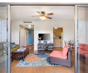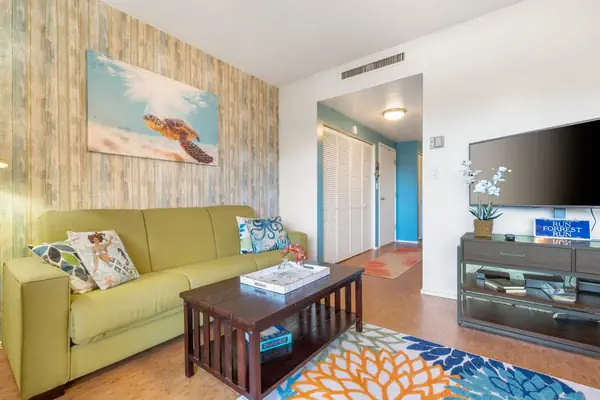 This vibrant and colorful, 1 bedroom, 1 bath condo sleeps 4. There is a Queen Size Bed in the bedroom & a Futon Sleeper Sofa in the living room. You can keep cool with Central Air Conditioning, enjoy the comforts of home with Wi-fi Access, Washer/Dryer, Fully Equipped Kitchen, Two TVs located in the living room and bedroom, (48 inch in living room, 32 inch in bedroom) Elevator Access & Underground Covered Parking.
