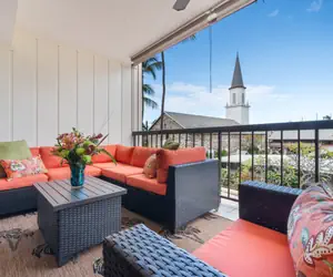 The spacious Lanai affords many opportunities for gazing with amazing views of the Historic, Mokuaikaua Church and gardens completed in 1837! Expansive sliding doors entice the fresh tropical air and sunlight into the living room, bringing the outside in. Relax and enjoy the peace and tranquility.