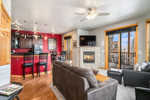 The open living area features a comfy queen sleeper sofa, gas fireplace, flat-screen TV and beautiful mountain views. The kitchen is well-equipped with full-size appliances, a dining table that can seat six and everything needed for quick and easy meal prep. The stacked washer and dryer are located in a closet off of the kitchen.