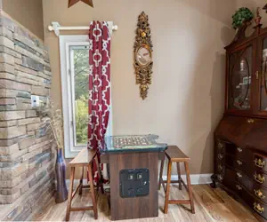 Step into the cozy living room and be enveloped in comfort and relaxation. This inviting space is designed to make you feel at home, with a plush sofa sleeper perfect for a quick nap or overnight guests, a 4-person couch for lounging with friends and family, and a comfortable armchair for curling up with a good book. The focal point of the room is the crackling gas fireplace, where you can warm up on chilly mountain evenings and enjoy the charm of the surrounding stone hearth. A large flat-screen TV provides endless entertainment options, while the room's bright windows offer stunning views of the surrounding mountains. The perfect spot to unwind after exploring the Great Smoky Mountains is the Enchanted Primrose's living room, where memories are made and relaxation is key.