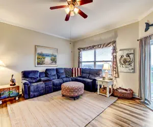 Step into the inviting living area, where you can unwind after a day of beach adventures. The condo is equipped with modern amenities, including air conditioning, ceiling fans, and a flat-screen TV for your entertainment.