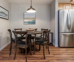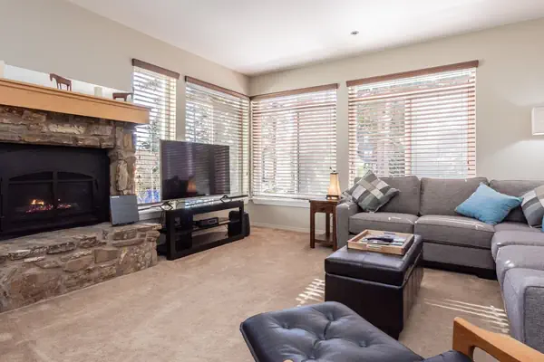 The welcoming entryway has a bench, lots of coat hooks and closet space for your outdoor gear. The living area faces out towards a corner of large windows and is flooded with an abundance of natural light and views of the surrounding pine trees. The decor is tasteful with a mountain cabin feel but with a contemporary twist. Relax on the over-sized sectional couch or luxurious recliner chair and enjoy the cozy gas fireplace and stream your favorite programs and movies on the 55” Smart TV. For additional entertainment, enjoy the wide selection of board games or stream music through the Bluetooth Sound Bar. The kitchen features new stainless steel appliances, ample counter space and is well equipped with everything you need to enjoy cooking a wonderful meal without having to leave the premises. The six-person round dining room table and kitchen counter bar complete the open and inclusive floor plan.