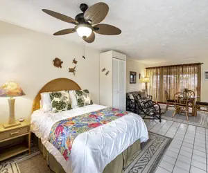 There is a Queen sized bed, plenty of seating in the living area, flat screen TV, complimentary Wi-Fi, plus a lanai with outdoor seating.