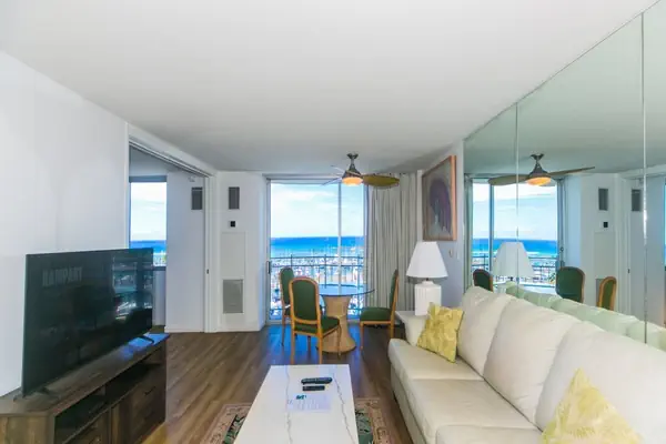 This 10th floor unit completed renovations in December 2023! The bathroom was extended for added functionality, and the kitchen now features a custom lower bar, perfect for dining or as a workstation! The unit comes fully furnished, including a luxurious leather sofa - perfect for sinking into as you enjoy a leisurely day gazing out at the crystal blue waters! With a 180-degree ocean view, this one-bedroom condo at the Ilikai Marina is the ideal spot for both vacationing and teleworking!