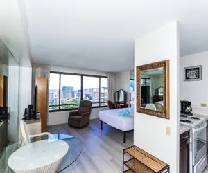 Large windows showcase panoramic views of the city and mountains, creating a serene backdrop for your stay. Inside, you'll find a thoughtfully designed open layout with a comfortable seating area, a well-equipped kitchen, and generous storage space. Ideally situated near top attractions, dining, and shopping, this studio is the perfect home base for your island adventure.