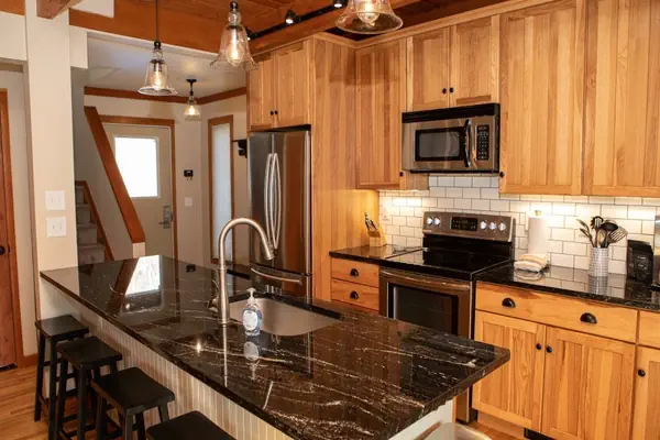 There main floor bedroom has a queen bed and is adjacent to the half bathroom and laundry room with a washer/dryer. Upstairs, the primary bedroom features a king-sized bed and beautiful views of the mountain. The primary en suite has been completely remodeled with new countertops, sinks, and tile work. There is also a futon that sleeps an additional 2 people. The second bedroom upstairs has a queen bed and a bunk bed. There is a large walk in closet and it is across the hallway from the second bathroom upstairs.