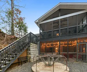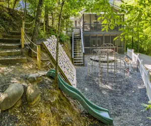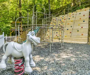 The Emory House is a favorite among adults, kids, and friends. The 15’x 42’ open kitchen/family room features a 75 inch smart TV and gas log fireplace. Located in the heart of Pigeon Forge, the Emory house is less than 6 minutes from Dollywood and many other attractions. What's new in the Emory House? Wainscoting in all high-traffic areas (dining area, hallway, stairwells, and game room) and a “Cubs’ Cabin” kids' playroom in loft bedroom #5, and all of the TVs with Roku remotes connecting to spectrum channel guide and local channels. Its rubber mulched playground features a zip line, a climbing wall, retro merry-go-round, retro jungle gym, retro iron ladder, rope ladders, slide, 2 spring riders, and a kids’ tea party table...that can all be viewed from the porches or from the kitchen window. There’s also a game room (pool table and arcade games), two huge screen porches (one with Hot Tub and the other with a wide porch swing and a day bed), a balcony, and an outside grilling patio (with a gas grill, a charcoal grill, park benches, and a fire pit). The variety and size of the different spaces at the Emory House make it ideal for family reunions, multi family vacations or any other large gathering. The Emory House sleeps 26, seven of its eight bedrooms have king beds, and every bedroom has its own bathroom.