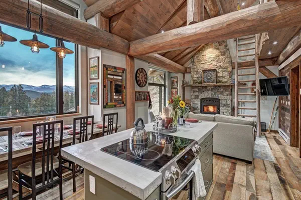 Step inside, and you’re greeted by an open floor plan filled with light and mountain character. The vaulted ceilings, warm wood tones, and log cabin touches create an atmosphere that feels both rustic and refined.