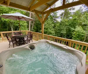 Step outside and unwind in the serene outdoor oasis, where the front deck area is the perfect spot to relax and rejuvenate after a day of exploring. The centerpiece of the outdoor space is a large hot tub. Soak away your worries and enjoy the peaceful wooded surroundings as you gaze at the starry night sky. Nearby, there is a fire pit and bench seating, perfect for chilly mountain evenings and roasting marshmallows. For the grill masters, there is a charcoal grill to cook a delicious meal. An additional outdoor seating area is ideal for reading, chatting, or enjoying the fresh mountain air. Whether you're looking to relax, recharge, or enjoy quality time with loved ones, the outdoor space is the perfect place to do it. So grab a cup of coffee, settle in, and let the serenity of the mountains wash over you.
