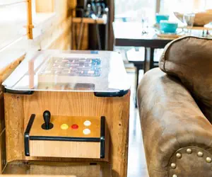 Step into the warm, inviting living room where rustic charm and comfort meet entertainment. The focal point is an elegant electric fireplace, casting a soft glow that enhances the cozy atmosphere. A flat-screen TV is perfect for movie nights or gaming sessions. An arcade game sits nearby, adding a playful, fun touch. The space features a comfy loveseat and sofa sleeper, creating an ideal spot for relaxing with friends or hosting overnight guests. A chess table invites friendly matches, making this living room a perfect blend of leisure and warmth. A washer and dryer are included for your convenience.