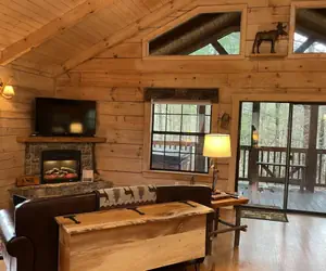 Plenty of ways to melt the stress starting with a hot tub and followed up with snuggling up in an afghan on the leather sofa for a private showing of your favorite movie. There is no noise here other than the birds for company. Warm yourself by the stack stone fireplace on chilly mountain evenings or use the fire pit outside to enjoy the mountain views and forest noises. Cabin includes a heavenly king size bed, full size kitchen, outside charcoal grill, washer, dryer, and full bath.