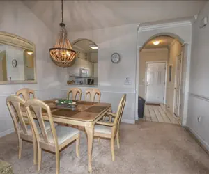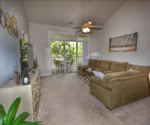 The great room is appealing and inviting with a comfortable sofa and lounge chair. The modern open floor plan design makes it perfect for gatherings and dining inside or out. Your home entertainment is complete with a large screen TV and DVD player.