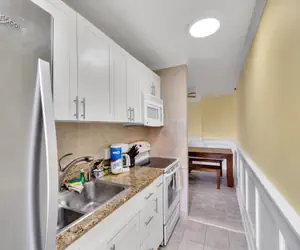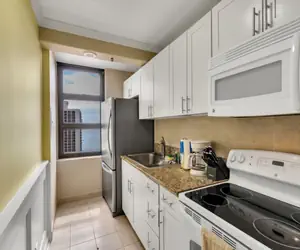 This upper floor condo has the best of both worlds, a birds-eye view of the bustling city and sparkling ocean. Better yet, is only a few short blocks from the World-Famous Waikiki beach! This condo comes with a fully equipped kitchen including a refrigerator, stove-range, dishwasher, microwave, coffee maker, and all the kitchen supplies you will need to have an at home cooking experience while you are on vacation. This kitchen comes with a large Dining Area for your enjoyment. Please sit back and relax in the airy living area that includes a large flat screen TV and cozy couch. The lanai includes lounge chairs and side table so you can enjoy a warm cup of coffee and watch the island sunrise!