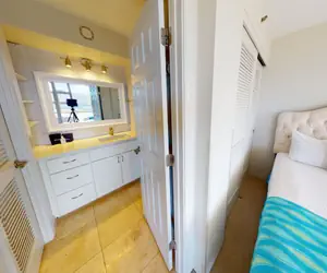 This unit has a great bedroom with 2 Queen Sized Beds and an amazing view from the window. The bedroom can be made private by the sliding partition doors or left open for a very spacious room. The beautiful bathroom right off the bedroom includes a spacious sink, drawers, and detachable shower head for your comfort and ease. This bathroom is perfect for relaxing and washing away all the sand and ocean after a great day spent at the beach!