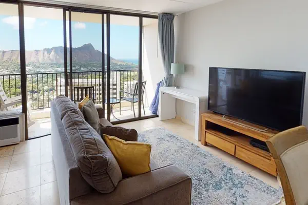 This 32nd floor condo has amazing views of Diamond Head, the beautiful blue Pacific Ocean, and is only a few short blocks from the world-famous Waikiki Beach! This high-end, recently renovated condo comes with a fully equipped kitchen which includes a refrigerator, stove-range, microwave, rice maker, coffee maker, and all the kitchen supplies you will need to have an at home cooking experience while you stay with us. This kitchen is complete with a dining table and chairs for memorable family dinners. Find joy and comfort while relaxing in this condo's spacious living area that includes a large tv, pull-out sofa, and desk. The lanai has a table and chairs so that you can enjoy a warm cup of coffee and watch the sunrise over the ocean!