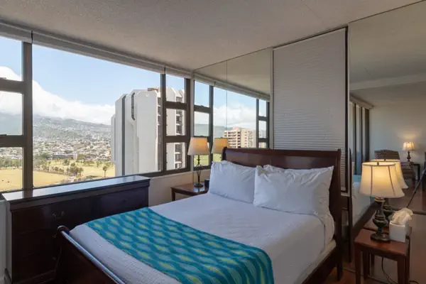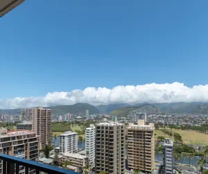 The pool and all associated amenities will be closed starting April 7, 2025, for an estimated duration of 10 to 14 months to accommodate the Recreation Deck renovation project. Experience breathtaking views of the Ko'olau Mountains and Ala Wai Canal from this spacious and stylish 1-bedroom corner condo on the 21st floor. The condo features a comfortable queen bed and a separate kitchen that opens up the main room.
