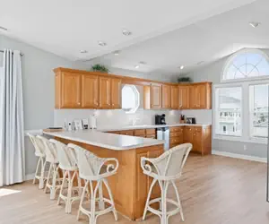 Designed with an inverted floor plan, the home includes two living areas—one with a full-size sleeper sofa—and a downstairs living area with a 75" TV and a half bath on each floor. The second-floor wall of windows showcases breathtaking ocean views, while the spacious kitchen, dining room, and island create a perfect gathering spot for meals, games, and family fun.
